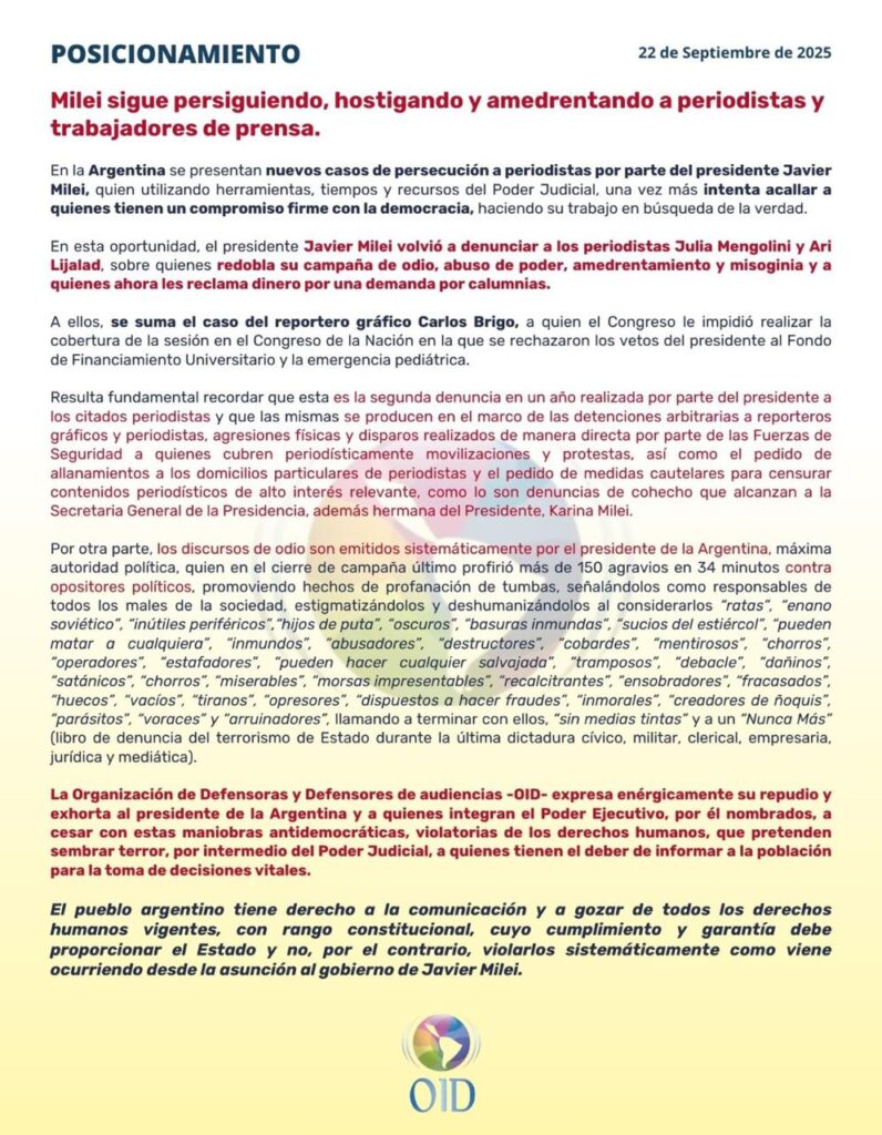 Desde la Asociación Mexicana de Defensorías de Audiencias denunciamos que Milei continúa persiguiendo, hostigando y amedrentando a periodistas y trabajadores de prensa.